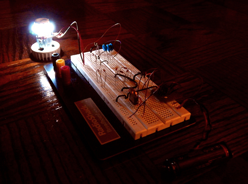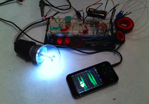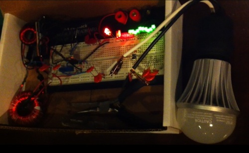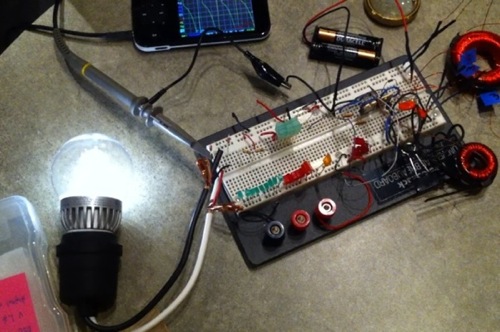 2-watt LED bulb running on a AA battery, 450 turn toroid. |